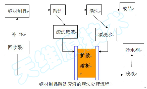 不銹鋼、鋼簾線等鋼鐵工業中酸洗液有硫酸、鹽酸及硝酸-氫氟酸洗液。我國此類廢液排放量驚人,目前此類廢液的處理還主要采用酸堿中和、冷卻結晶等方法,但與膜滲析法相比,各種方法都存在著原材料浪費和成本高等問題。膜法處理此類廢液,可用酸洗水(一般含鐵<0.5%)作為吸收液來回收廢酸液中的酸,回收酸返回系統繼續使用,這樣既為企業節約了資源,又解決了環境問題。